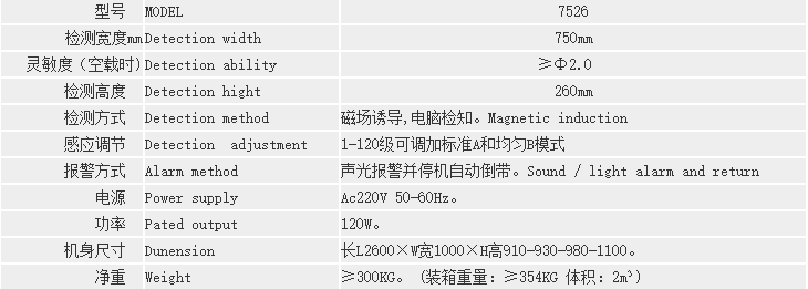 说明:检针机灵敏度的高低由检测高度(即通道或龙门)来决定最高检测精度。龙门越高,灵敏度就相应降低。以上对应的高度和检测标准是在空机状态下的检测结果;检测通道高度和宽度,都可以按要求定做!