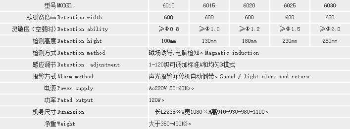 说明:检针机灵敏度的高低由检测高度(即通道或龙门)来决定最高检测精度。龙门越高,灵敏度就相应降低。以上对应的高度和检测标准是在空机状态下的检测结果;检测通道高度和宽度,都可以按要求定做!